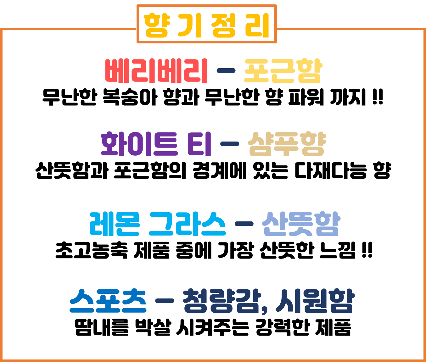 향기 자체가 모든 향기를 묻어버리는 파괴력이 있어서, 땀내도 삭제 시켜버려요.