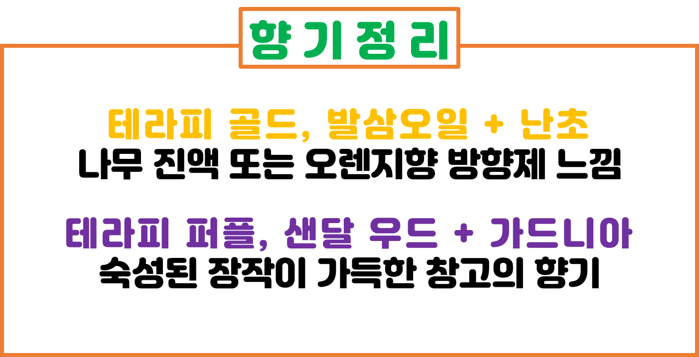 은은한 나무향기. 나무로 된 지하 창고 들어가면 나는 듯한, 편안한 향기 입니다.