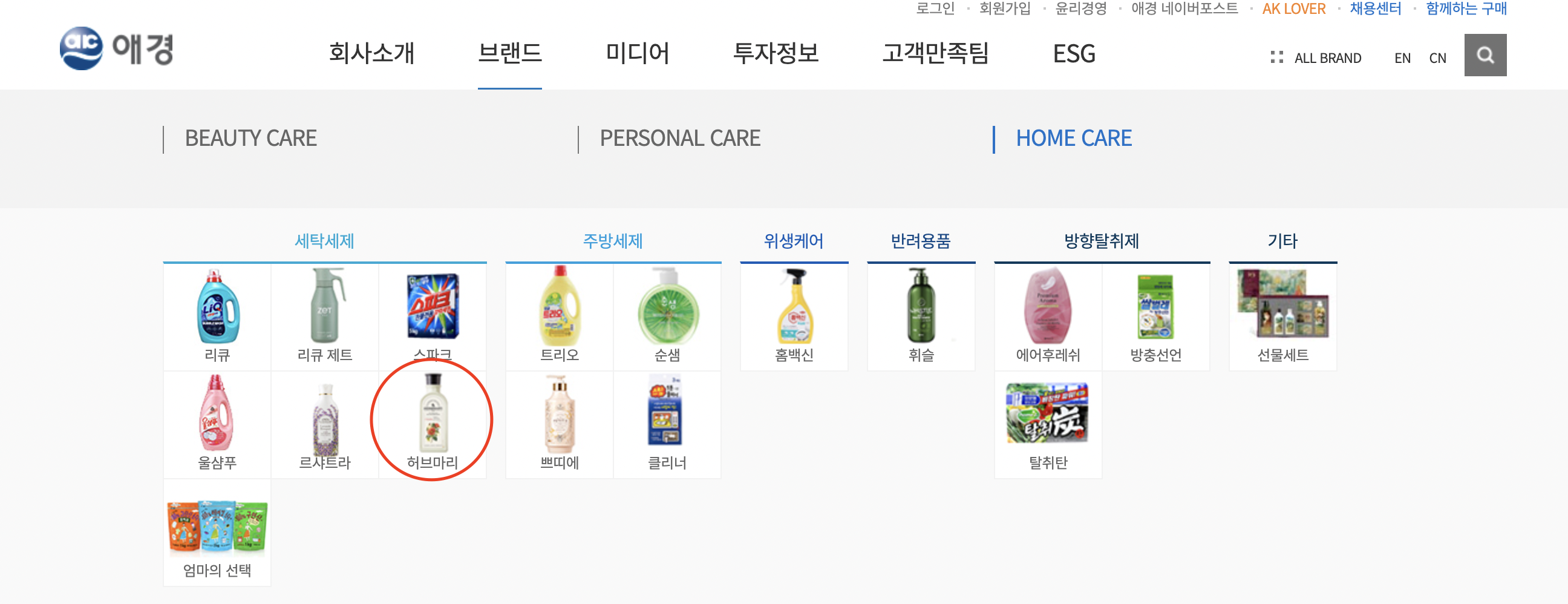 애경을 치면 이렇게 상단 메뉴에서 브랜드-허브마리