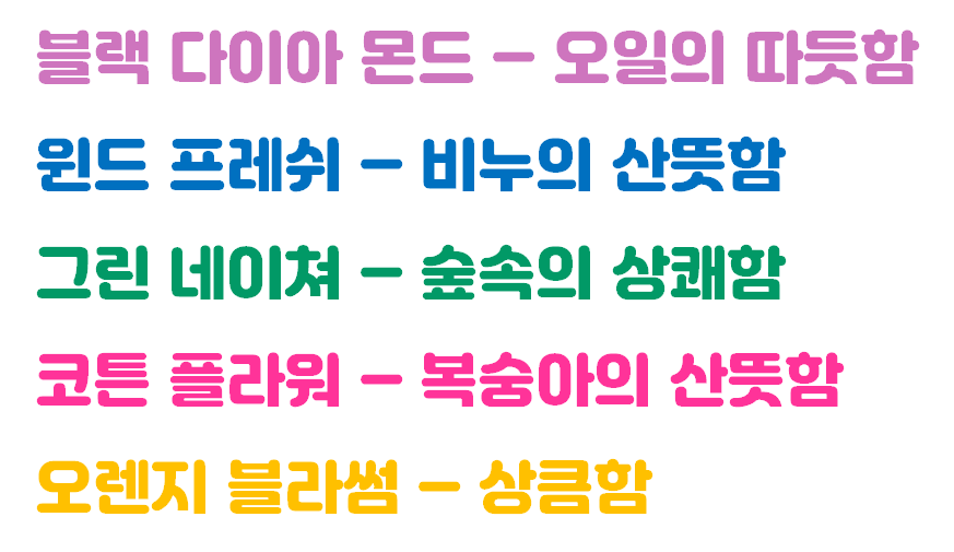 제품별로 향기, 느낀점 소개하는 시간입니다.